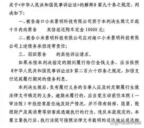 法院在审理后认为,小米拿出来的格式条款里,“没验车、没交车就要限期付款,不然就没收定金”这一条“不公平、不合理”,违反了诚实信用原则,无法律效力。最终法院判决,小米海口公司得在判决生效后10天内,给李女士双倍返还购车定金,小米景明科技有限公司对这笔债务承担连带责任。